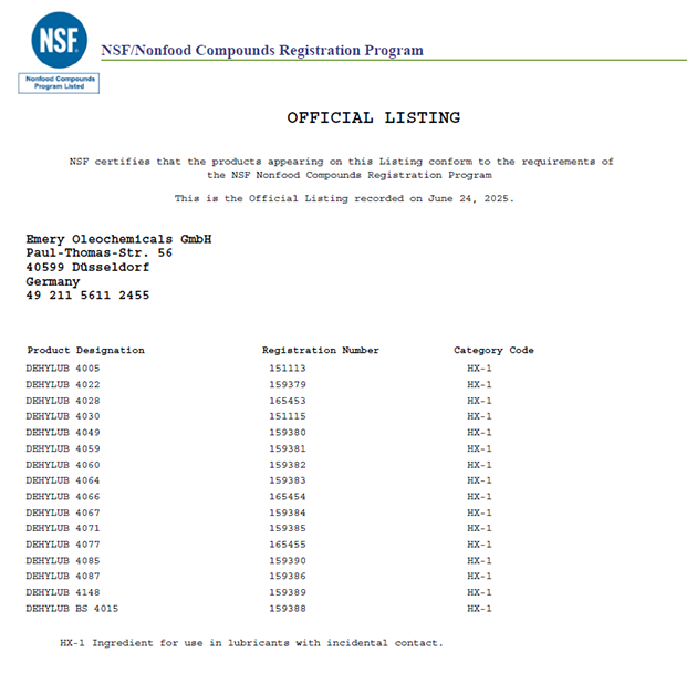 In order to enable our customer to develop and formulate lubricants for incidental food contact, Emery already has several ester products approved and listed on the NSF White Book as HX-1 compounds.